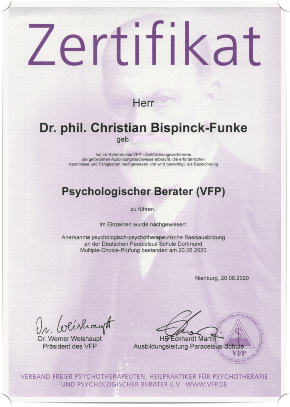 Ich bin zum psychologischen Berater ausgebildet; die Fortbildung habe ich mit dem Prädikat „Zertifizierter Psychologischer Berater“ abgeschlossen. Ich habe diese Weiterbildung auch deshalb gewählt, um unterscheiden zu können zwischen klinischen psychischen Störungen und geistig-spirituellen Anliegen.