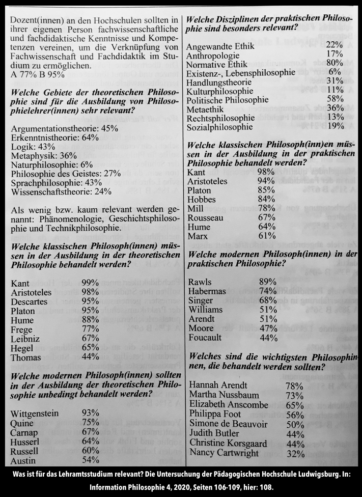 Abgebildet sind Ergebnisse einer Umfrage unter LehramtsstudentInnen und DozentInnen aus Lehramts-Lehrgängen das Studienfach Philosophie betreffend